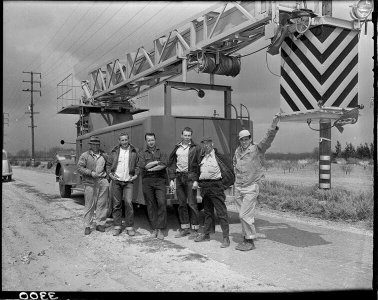 Transmission Dept - insulator washing machine - with boom lifted [close-up of man shooting water on insulators].