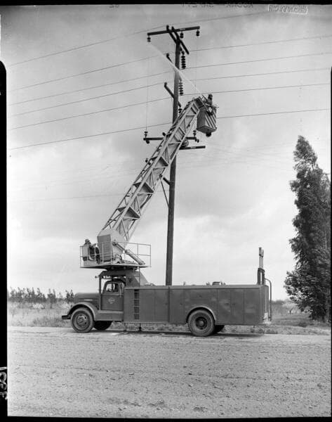 Transmission Dept - insulator washing machine - with boom lifted [close-up of man shooting water on insulators].