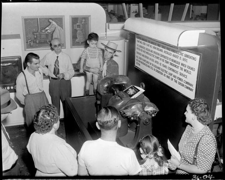 Edison Booth at a fair. - "100 years of Electrical Progress" - 4 men with cowboy hats hosting display.