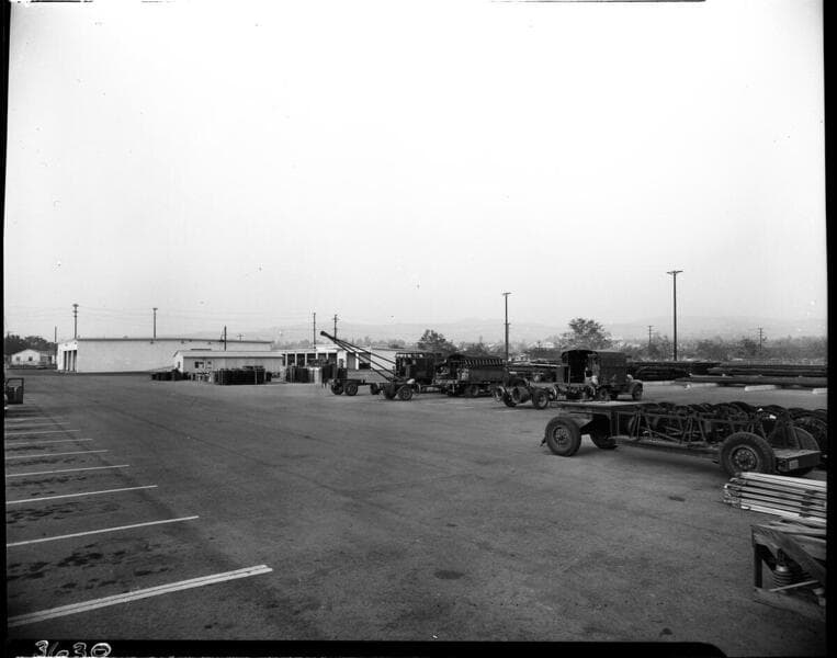 [Off loading poles in a desert transmission line corridor. ] [with 30 variants]