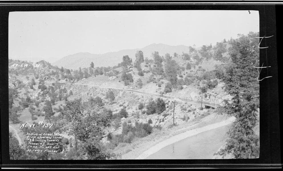 Borel Powerhouse - Borel Canal - Looking West against cross section of dam - old highway.
