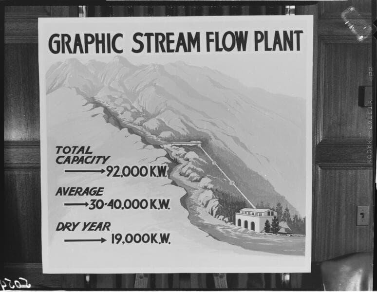 Graphic showing layout of a "Reservoir Supported Hydro Plant" is taped to a wall for this copy neg.