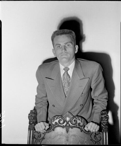 A man standing in a photographer's studio behind an Arts and Crafts-style wooden bench.