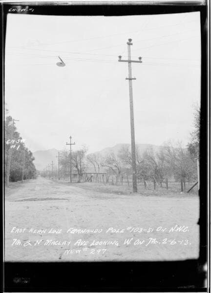 Kern T/L - Borel to Kern Substation - West Kern Line - P105-12 - First pole on Northwest corner of Sixth and College Streets, in San Fernando City.