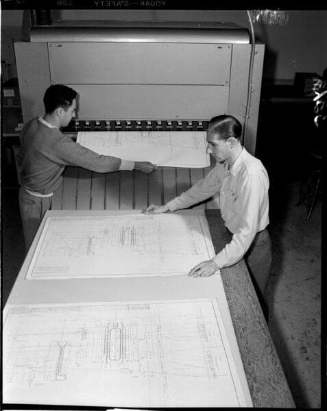 [Large shafts or pipes being turned in a machine shop - girls scouts on ocean cliffs] - [with 11 variants]