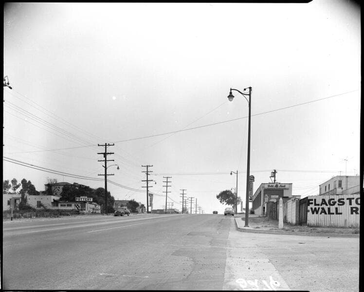 Street light in a business area - daytime. (Inglewood Auto Repair - rebuilt engines installed in 3 hours for $59.95)