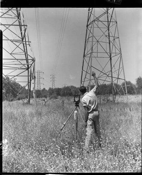Transmission line corridor - area with staged equipment, poles and conductor for line construction work.