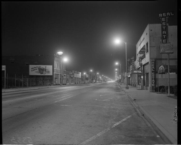 Street lighting at night in a business district near Mission Ave.