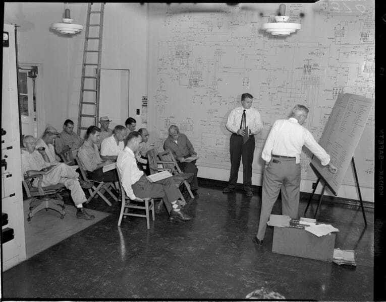 Pilot and passenger reviewing snow survey map at door of helicopter.