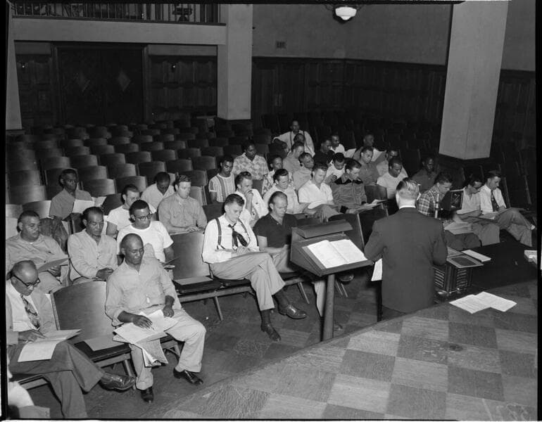 Group of Edison General Office workers in front of the Christmas tree in Edison lobby.