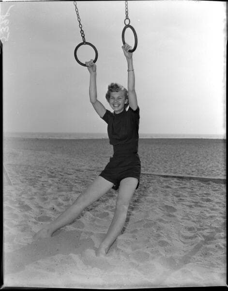 Young lady in shorts and polo shirt sitting on trapeese at the beach.