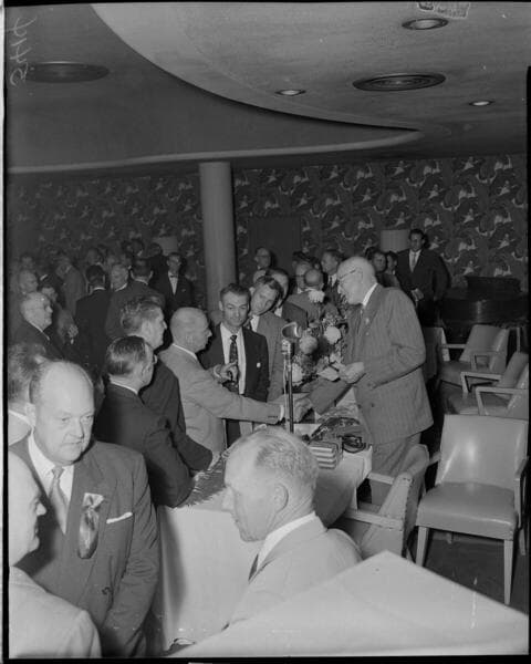 Black and white photograph of Harry Chandler's 77th birthday. He is shaking hands with Nadine Evans, another woman watches. Sue Reeves Collection.