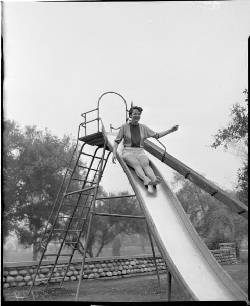 Young lady in shorts, sweater, and heals climbing steps for slide at a park playground.