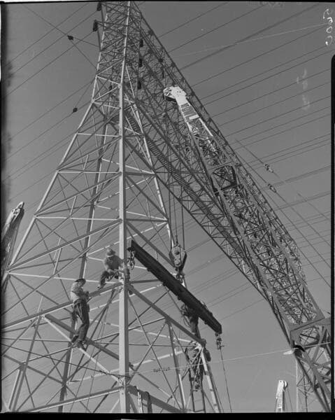Construction work raising 12 circuit towers out of Eagle Rock Substation