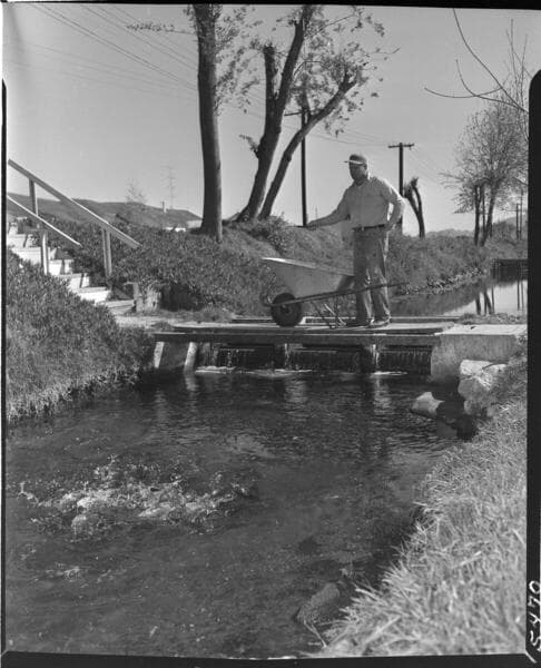 Man with a wheelbarrow on a small bridge feeding fish in the stream