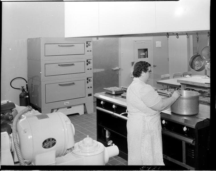 Chef cooking with a large pot on electric range in commercial grade kitchen