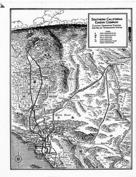 Map of Southern California showing the early transmission line corridors belonging to Pacific Light and Power, Southern California Edison and Southern Sierras Power Co