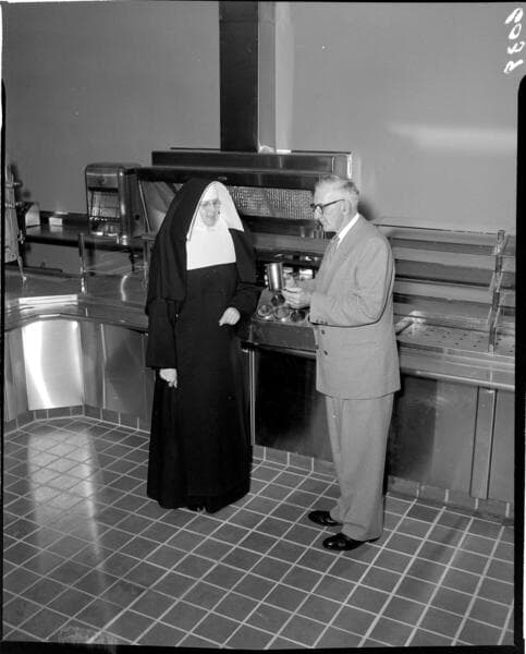 Saint Francis Hospital nuns receiving Merit Award from Institutions Magazine in hospital kitchen.
