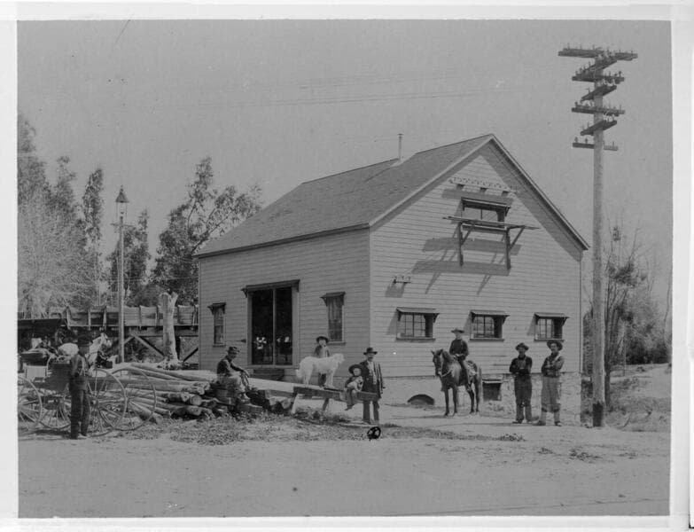 The delivery of material by horse drawn wagon to the building of Santa Ana River #1 Hydro Plant