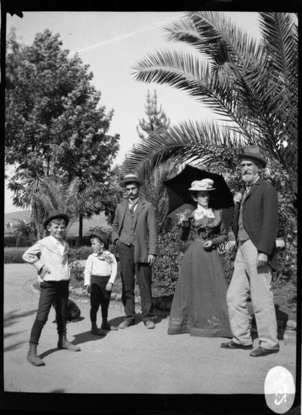A family, featuring a man and woman, an elderly man, and two young boys, and a dog. They may be standing in a driveway. (Pearson family photo?)