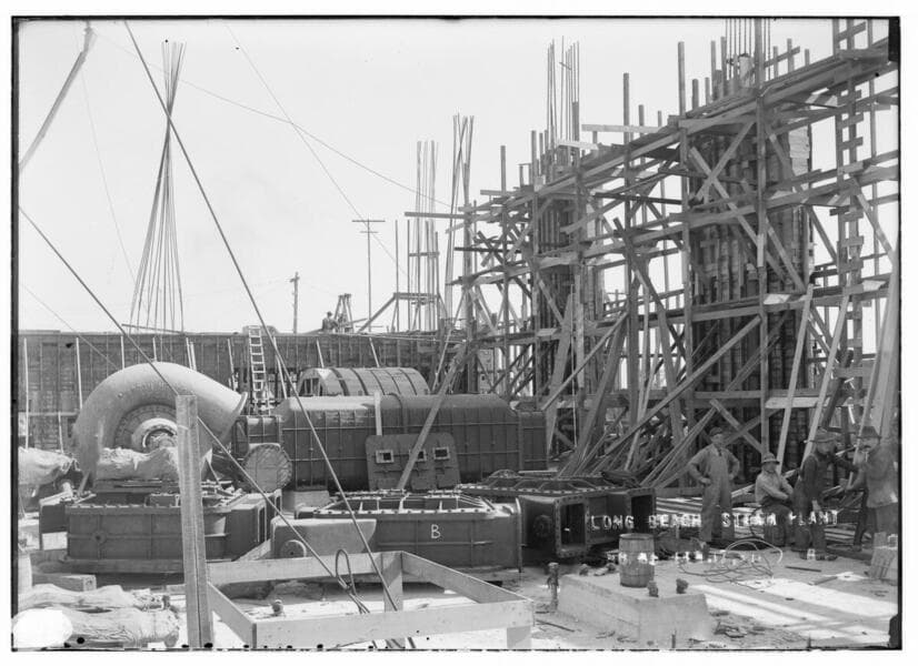 Long Beach Steam Station, Plant #1 - Construction crew and equipment inside the engine room at Plant 1.
