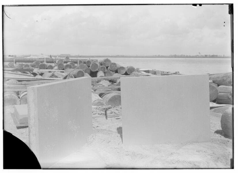 Long Beach Steam Station, Plant #1 - Artificial Stone Yard - [man standing amidst the pieces of concrete facing blocks to be used on the Plant.]