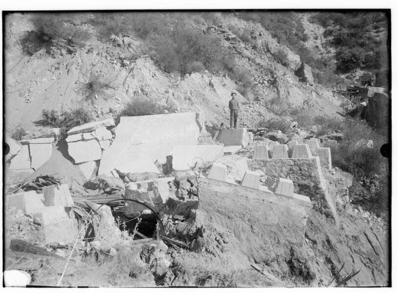 Santa Ana River #1 Powerhouse - forebay, destroyed. [A man is standing on the forebay]