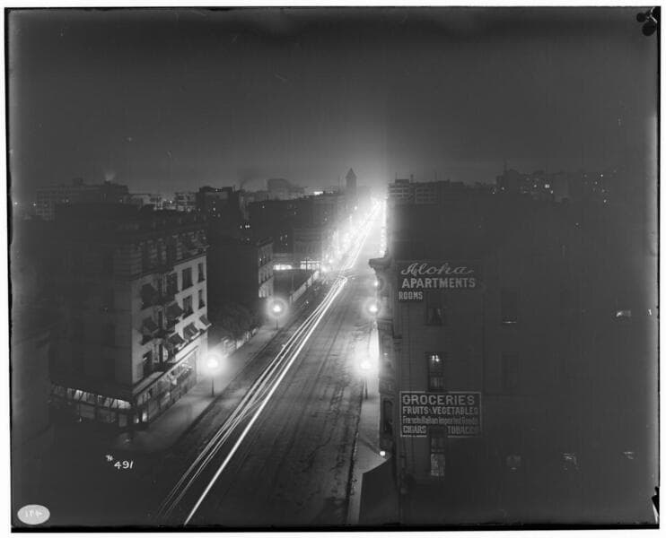 L1.2 - Lighting, streets - A night photo taken at East 5th Street in Los Angeles [showing an apartment house advertising rooms for 50 cents to $1.00.]