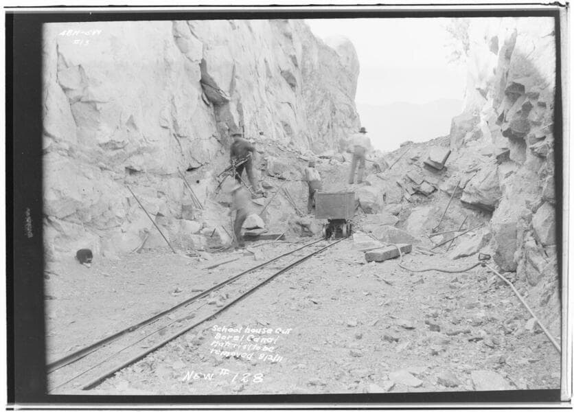 Borel - Canal at School House Cut - construction photo taken at lower end. [Ore carts are on tracks to haul tailings away.]