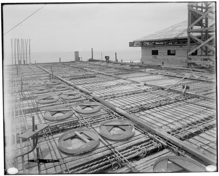 Long Beach Steam Station, Plant #1 - 2nd floor Transformer House addition. [men placing reinforcing steel for floor]