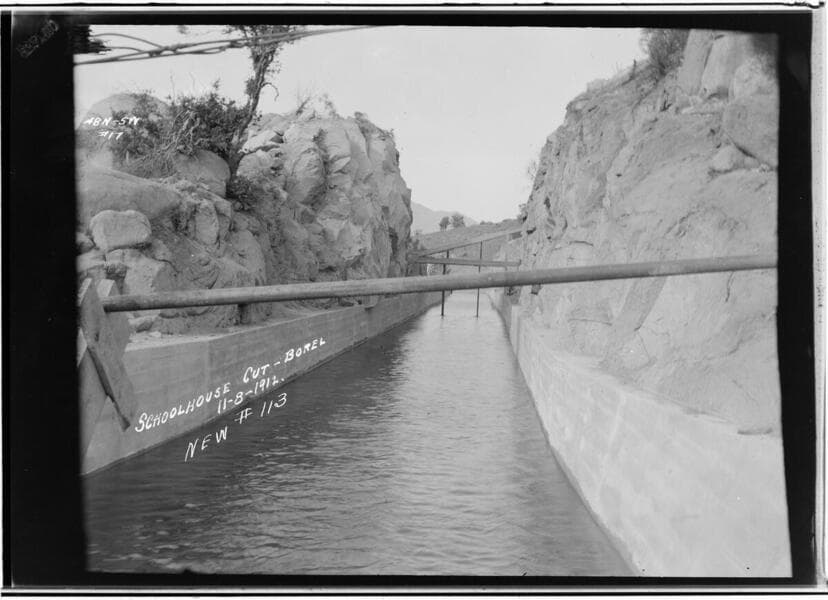 Borel - canal at School House Cut. View from lower end of proposed flume looking up-stream at time of construction