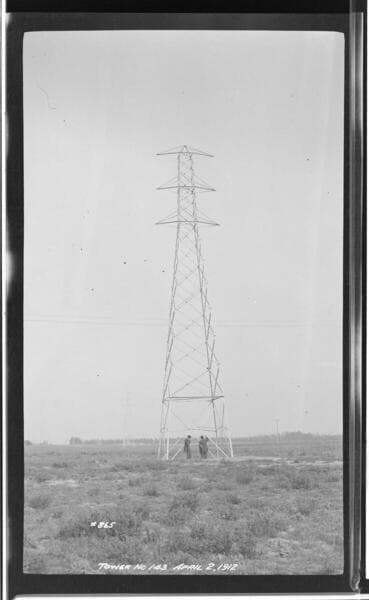 Long Beach-Lighthipe-Laguna Bell Transmission Line - Several men doing a test on the insulator cross arm on the Long Beach transmission line tower.