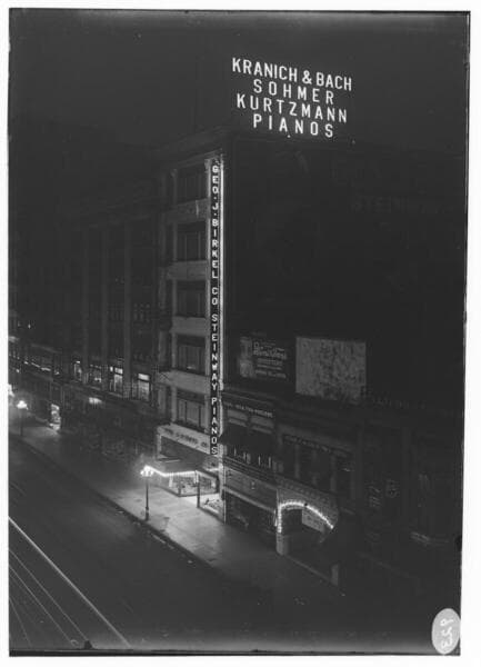 L1.2 - Lighting, streets - A night photo of an electric sign at Geo. J. Birkel Co. Steinway Piano store.