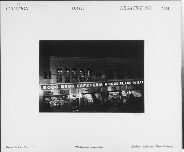 L1.2 - Lighting, streets - A night photo of an electric moving sign at Clune's 5th Street Theatre.