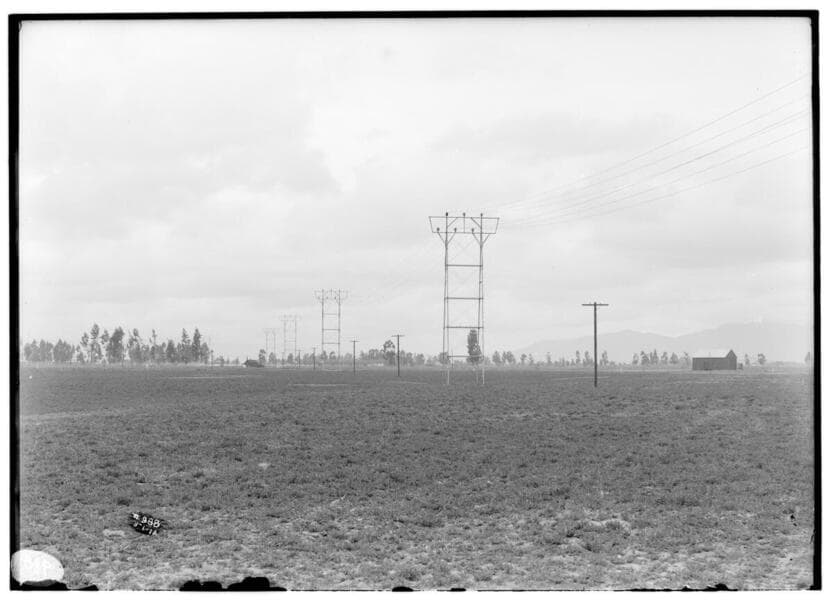Miscellaneous Transmission - The Kern River Tower Line looking south from McNeil Substation (in Burbank). [Note the changeover from pin to suspension insulators.]