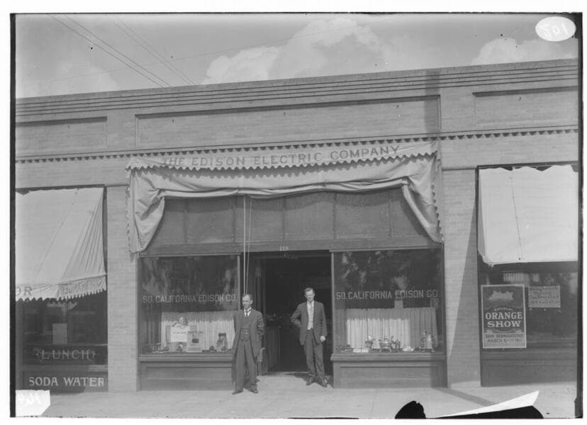Local Offices A-Z - Old Edison Electric Company office in Redondo. [exterior showing men sitting outside and a horse-drawn buggy.]