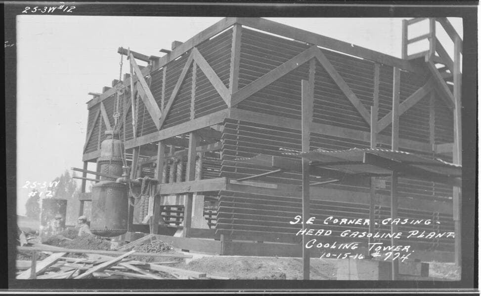 Oil Wells - Cooling tower, casing head gasoline plant. View showing Southwest corner.