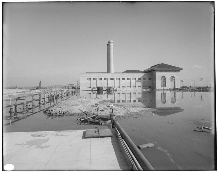 Long Beach Steam Station, Plant #1 - Top oil tank and pouring concrete for construction of Oil Pump House.