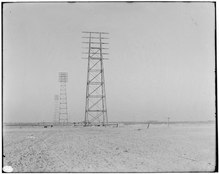 Long Beach-Lighthipe-Laguna Bell Transmission Line - Steel towers for outgoing lines - An electric tower measuring 185 feet at the Long Beach Steam Plant near the salt works.