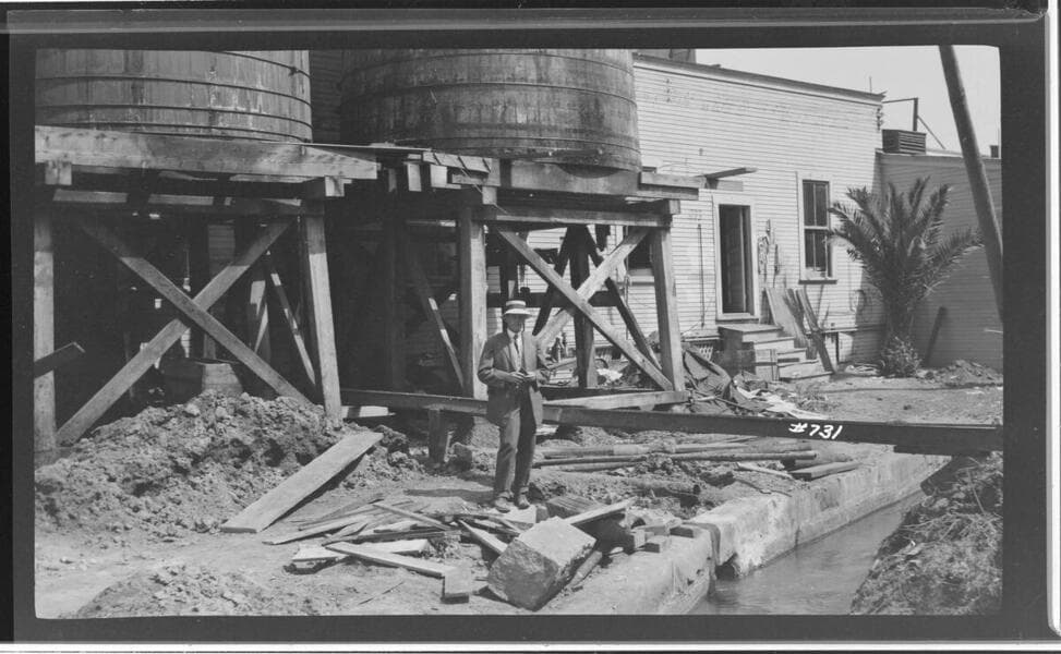 B1.1 - Buildings Miscellaneous - Santa Barbara Bath House - Shower bath at rear. [people showered and walked through a bath to wash off sand before entering bath house after swimming in the ocean.]