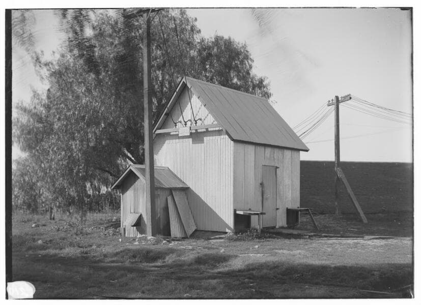 Redlands Substation - Redlands - Steam plant property. The two fuel oil tanks, the cooling tower, and condenser reservoir were located just north of the powerhouse.