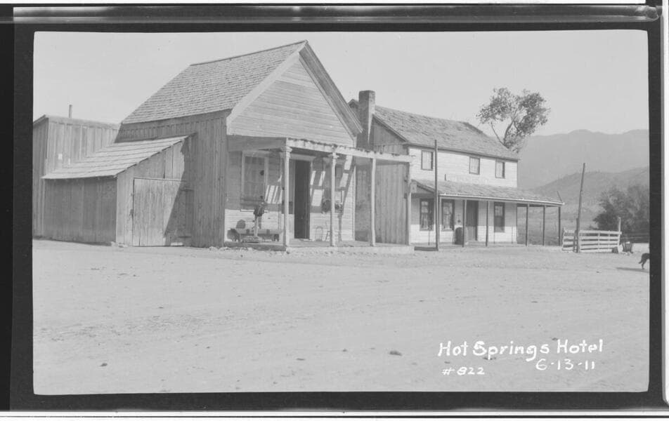 Southern California Views - An area view of Zepher Avenue in Venice, California, [showing the Hotel Rose, residences behind the hotel, people on the street and automobiles common to 1914.]