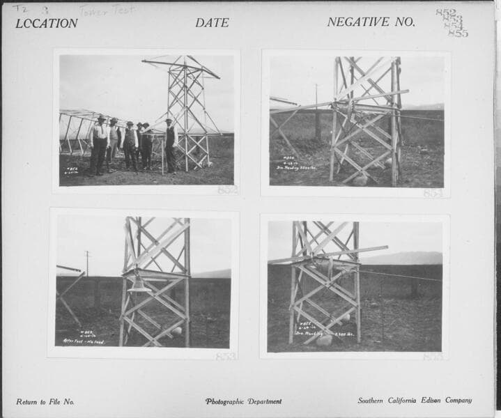 Long Beach-Lighthipe-Laguna Bell Transmission Line - Several men doing a test on the insulator cross arm on the Long Beach transmission line tower.