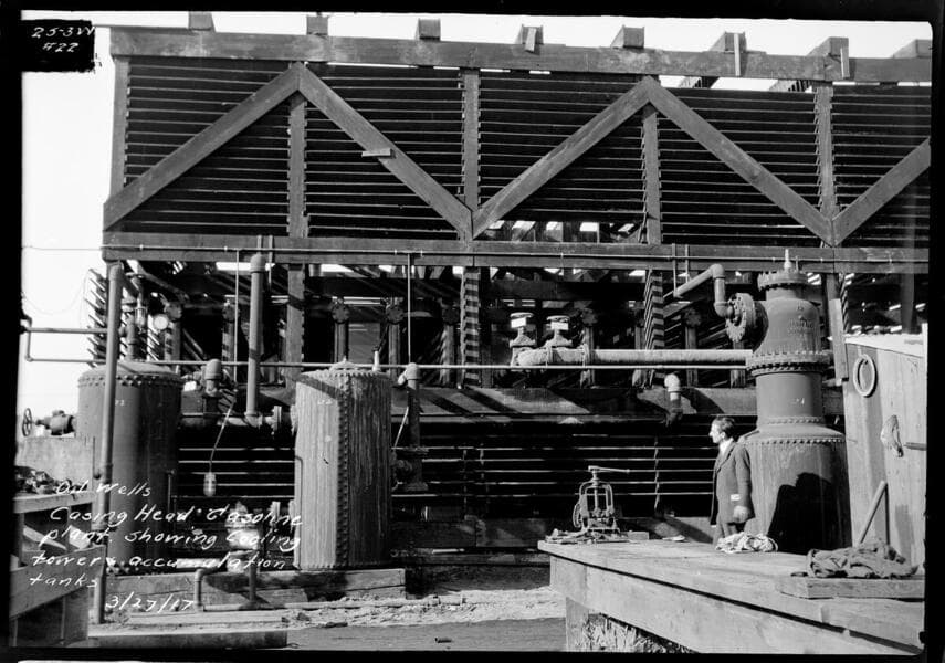 Oil Wells - Casing Head Gasoline Plant showing cooling tower, gas separator, and storage tank.