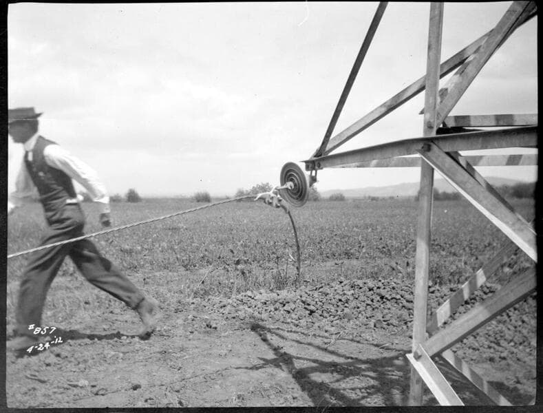 Long Beach-Lighthipe-Laguna Bell Transmission Line - Showing a test on the insulator cross arm on one of the Long Beach Transmission Line Towers.