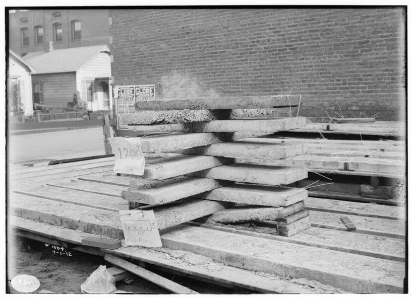 T2 Testing - A man showing a detail of a test of concrete slabs for the Fourth Street General Office Building in Los Angeles at 1700#.