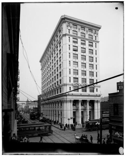B1.1 - Buildings Miscellaneous - The Hotel Huntington apartment house on the corner of E. 8th and S. Main Streets in downtown Los Angeles, showing trolley tracks.