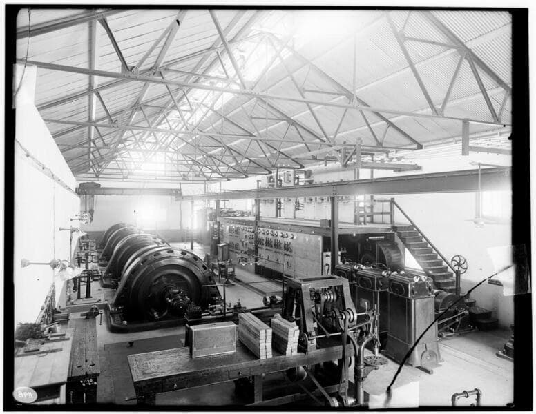 The interior of the power house at Santa Ana River #1 Hydro Plant, showing the generators, the switchboard, and the Lighthipe Automatic Governor.