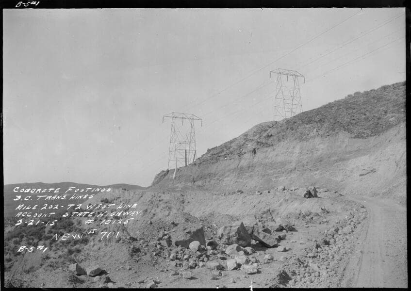 Big Creek T/L - Towers Mile 190 - tower 5 - Showing change in location of Mile 190 - Tower 5 - West Line made necessary by highway cut. Taken from West tower - Mile 191 - Tower 1, looking North.
