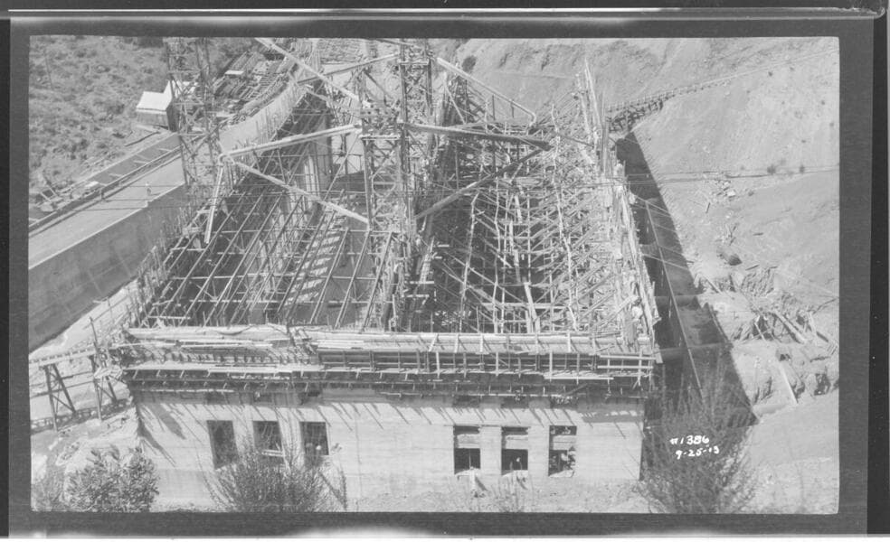 Los Angeles City Powerhouse - #1 along the Los Angeles River Aqueduct. [showing walls of powerhouse going up during construction]